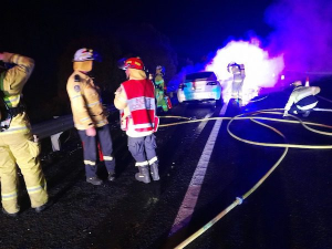 The car was no longer on fire when crews arrived, but they found a woman inside.